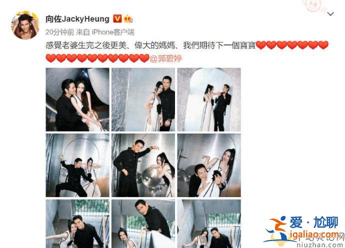 10月15日,向佐曬出一組與郭碧婷的合體寫真照,并配文寫道:“感覺老婆生完之后更美、偉大的媽媽、我們期待下一個寶寶”,文末還配了17顆紅心的表情并且還圈出了老婆郭碧婷,僅從發言來看顯然向佐是在大秀恩愛,同時還疑似透露出郭碧婷已懷二胎。從向佐配圖照片中可見,向佐身穿黑色西裝,梳著大背頭,郭碧婷一襲白色肩帶長裙,扎著長馬尾,二人或摟抱或搞怪,恩愛十足。