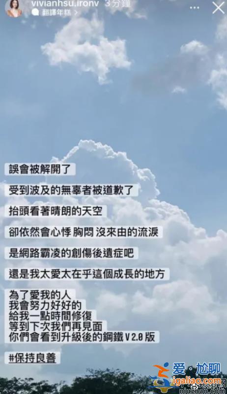 徐若瑄稱:“誤會被解開了,受到波及的無辜者被道歉了”!還配了一張晴空萬里的照片,看這意思,徐若瑄和王力宏與前妻之間的“誤會已經被解開了,那么這是收到李靚蕾的道歉?
