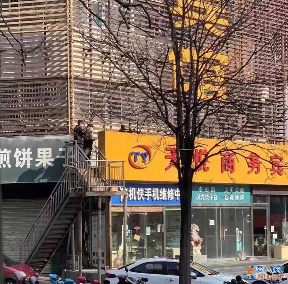 根據張先生在現場拍攝的畫面,民警前往事發銀行馬路對面的一家酒店門口,在貼有酒店招牌的門樓上架設狙擊步槍。根據地圖的距離測量,澎湃新聞記者發現,狙擊步槍架設的位置距離銀行大門不足百米。