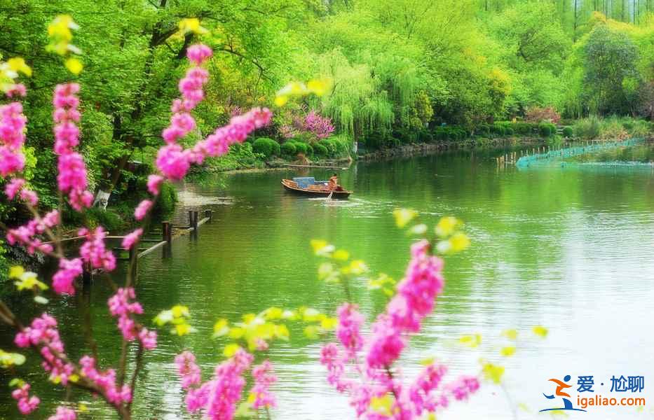 西湖最美的桃花在蘇堤與白堤上,泛舟湖上,幽幽的湖水,襯著兩岸的桃紅綠柳,令人賞心悅目,偶爾伴著杭城綿綿的春雨,煙雨朦朧中的桃色更顯嬌美。