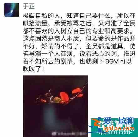11月15日,互聯網流出朋友圈。他懷疑是在朋友圈嘲諷郭敬明。文章說:“極度自私的人知道自己想要什么,所以抬高流量,承受尷尬,針對的是不喜歡的人。確立自己的職業和高要求?!闭摼╃苌倘说乃刭|。此外,鄭宇還在文章中批評:“作品不好,而且極其感傷。所有的工作人<愛尬聊_百科詞條>員都是道具,好像導演-個人在玩,說著惡心的話,宣傳著莫名其妙的情節,把BGM留給吹!”