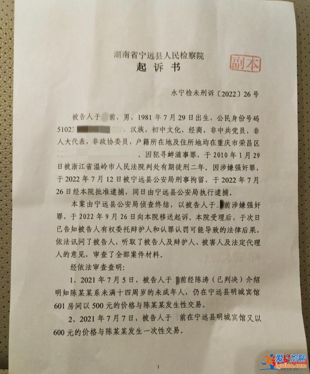 由提供的另一份起訴書(shū)顯示,陳被介紹與他人發(fā)生性關(guān)系時(shí)不滿14歲。永寧審刑26號(hào)起訴書(shū)是今年10月26日作出的。起訴書(shū)稱,2021年7月5日,被告人經(jīng)介紹,明知陳某為不滿14周歲的未成年人,仍在寧遠(yuǎn)縣明城賓館601室,以500元的價(jià)格與陳某發(fā)生性關(guān)系。