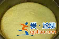 5、電飯鍋預(yù)熱,涂抹一層植物油,將攪拌好的原料倒入電飯鍋內(nèi),鍋在桌面磕幾下,震出原料中的氣泡;