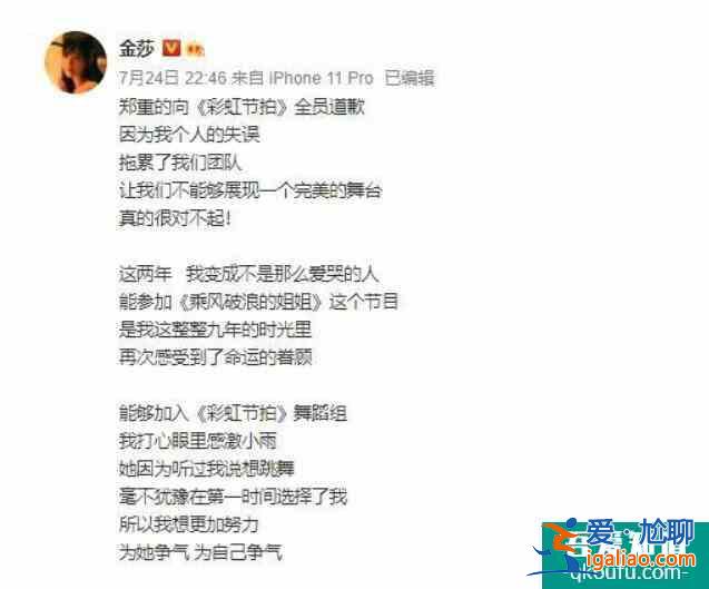 近日,在《乘風(fēng)破浪的姐姐》的第三場演出中,金莎因失誤在張雨綺集<愛尬聊_百科知識(shí)大全>團(tuán)《彩虹節(jié)拍》的演出中引發(fā)熱議。在表演的舞臺(tái)上,金莎的粉絲掉了兩次,金莎走下舞臺(tái)后放聲大哭。24日晚,金沙給隊(duì)友發(fā)了一封長長的道歉信。