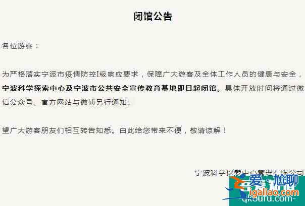 為嚴格落實寧波市疫情防控I級響應要求,保障游客和工作人員健康安全,寧波市科學探索中心、寧波市公共安全宣傳教育基地將立即關閉。具體開放時間將通過微信微信官方賬號、官網、微博另行公布。