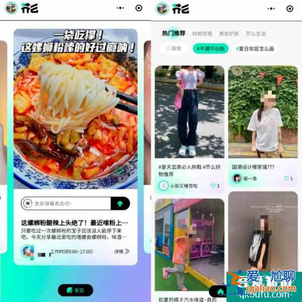 在首頁下發(fā)還設(shè)置有一個“發(fā)現(xiàn)”頻道,頻道內(nèi)的內(nèi)容更加豐富,以瀑布流的形式展示,頂部設(shè)有熱門推薦、時尚穿搭、美妝護膚、芥么生活等分類,每個分類下有多個話題,話題可定位到不同的潮流內(nèi)容。