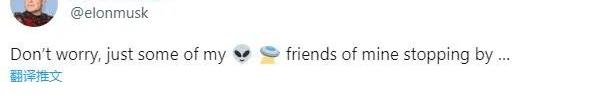 當地時間12日,馬斯克在其推特上寫道:“別擔心,只是我的一些朋友路過……”這位億萬富翁還在這句話中加入了外星人和不明飛行物的表情符號,以增加效果。