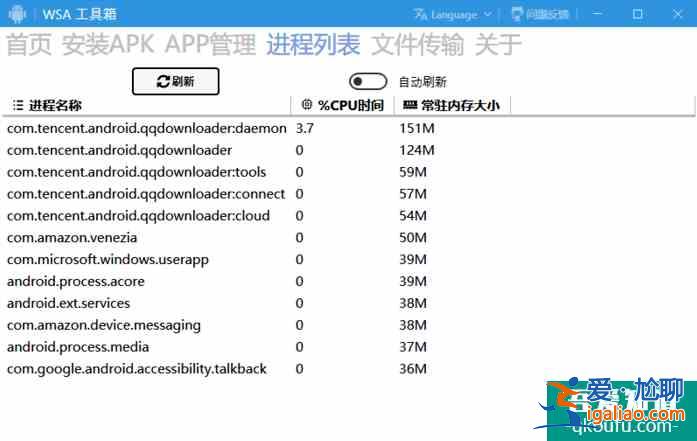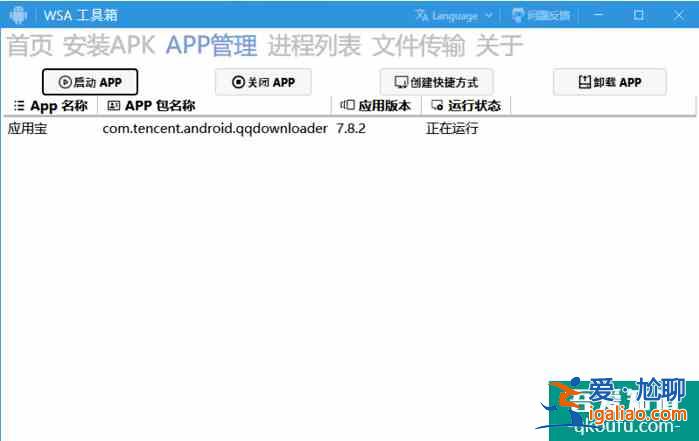 打開WSA工具箱可以看到上邊一排的功能選項,有安裝APK的,有管理APP(可啟動、關閉、創建快捷方式及卸載APP)的,還有顯示安卓子系統進程的,界面簡單粗暴,非常易于使用。