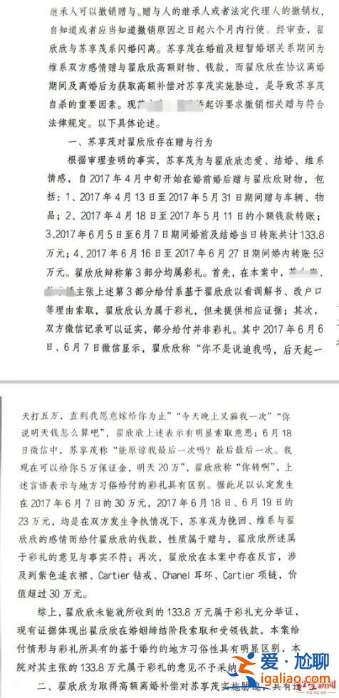 贈予合同糾紛一案判決書顯示,根據審理查明的情況,翟欣欣與蘇享茂相識至協議離婚僅110余天,其間收受蘇享茂贈與的車輛、物品、錢款價值超過300萬元,婚戀過程具有明顯的經濟特征。