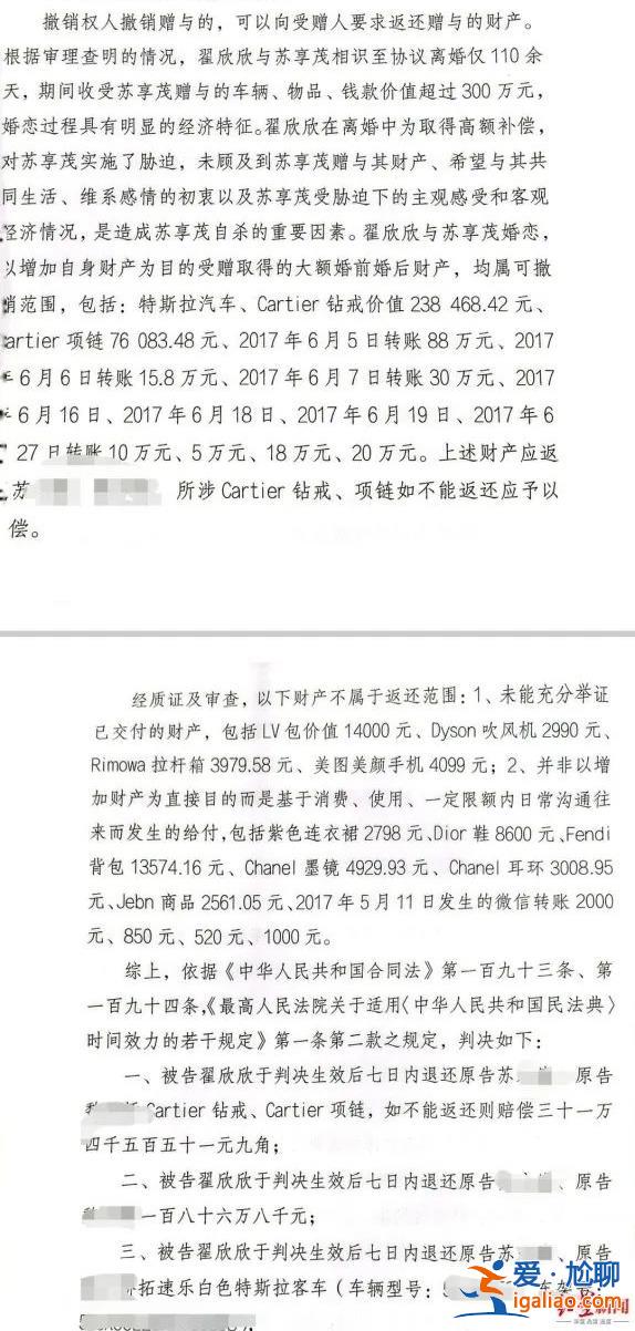 根據此份判決,翟欣欣需退還蘇享茂家屬價值約108萬元的特斯拉汽車一輛;退還價值30余萬元的卡蒂爾鉆戒和項鏈;退還轉賬共計186萬余元。