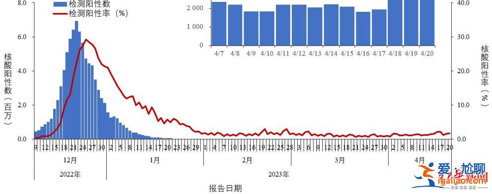 4月22日,中國疾病預防控制中心發布《全國新型冠狀病毒感染疫情情況》,2022年12月9日以來,各省份報告人群新冠病毒核酸檢測陽性數及陽性率呈現先增加后降低趨勢,陽性人數12月22日達到高峰后波動下降,2023年4月20日降至2661例;檢測陽性率2022年12月25日達高峰后波動下降,2023年4月20日為1.7%。
