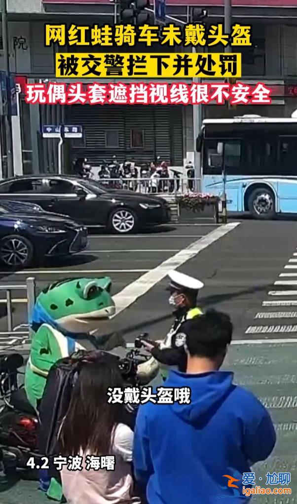 今年4月,浙江寧波海曙區交警正在路口執勤,發現有人穿著“網紅蛙”的人偶服騎著電動自行車出行,交警將其攔下,發現騎車的是一名男子,沒有佩戴安全頭盔。