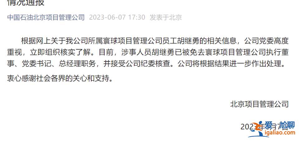 6月7日,寰球項(xiàng)目公司所屬的中國(guó)石油北京項(xiàng)目管理公司發(fā)布通報(bào)稱,涉事人員胡某勇已被免去寰球項(xiàng)目管理公司執(zhí)行董事、黨委書記、總經(jīng)理職務(wù),并接受公司紀(jì)委核查。6月8日,據(jù)媒體報(bào)道,該企業(yè)同時(shí)表示董某某也已經(jīng)停職,接受調(diào)查。