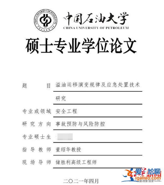 網(wǎng)傳2021年4月,董某某的碩士論文題目是《溢油運(yùn)移演變規(guī)律及應(yīng)急處置技術(shù)研究》,指導(dǎo)教師為董紹華教授。