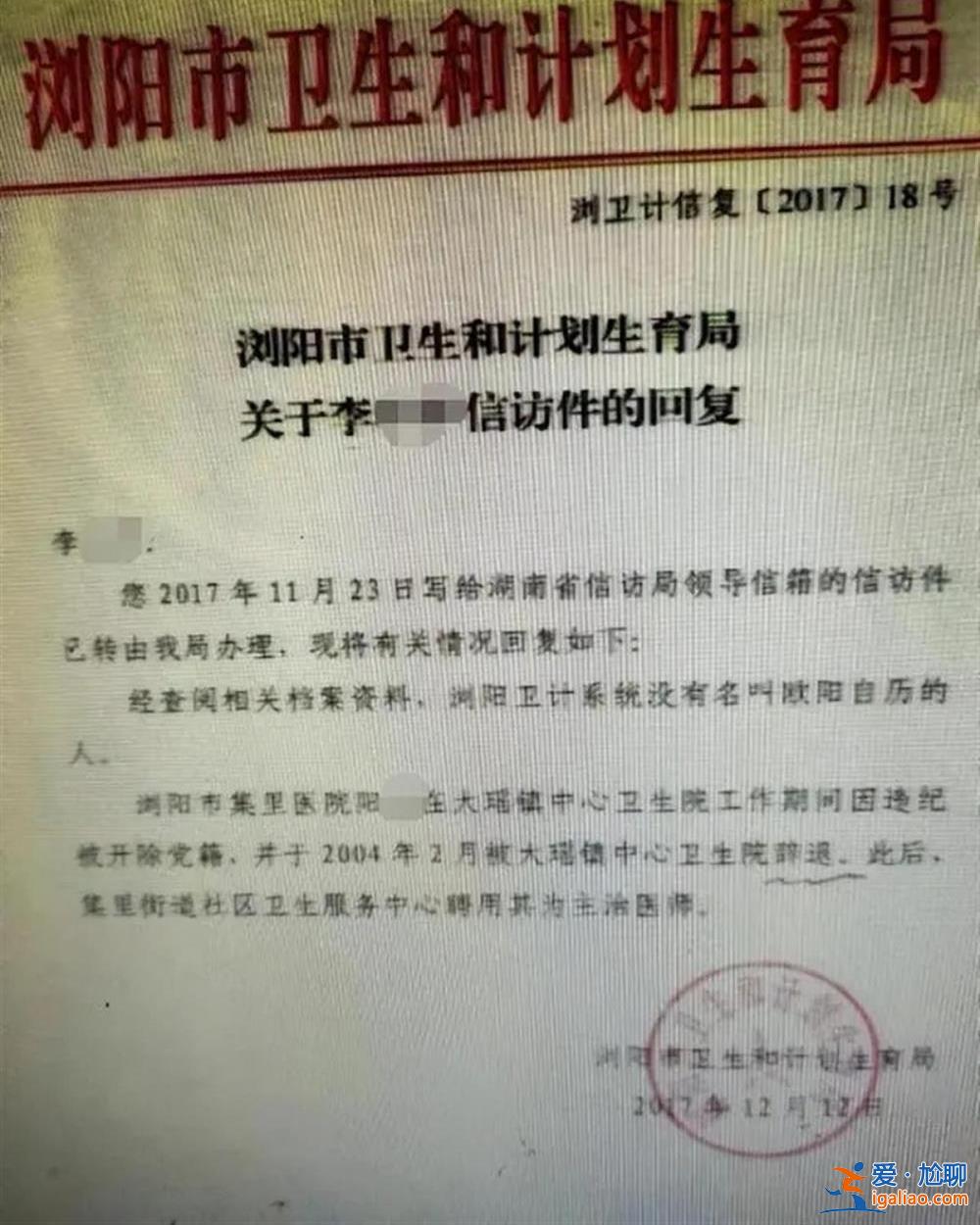 瀏陽市衛(wèi)生和計(jì)劃生育局2017年12月出具的信訪回復(fù)函