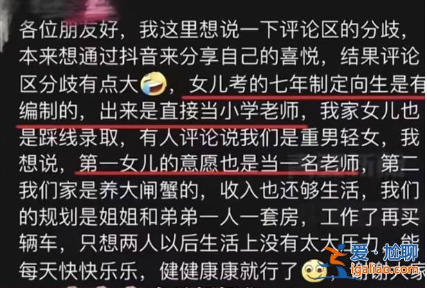 據女孩媽媽稱,孩子考的“七年貫通培養師范定向生”是有編制的,出來直接當小學老師。家里不缺錢,只<愛尬聊_尬聊生活>希望姐弟倆以后生活輕松快樂。