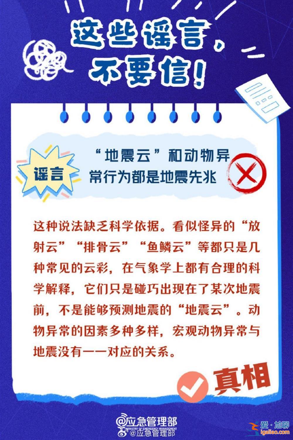 隨后,應急管理部官方微博就所謂“地震云”相關說法進行辟謠:云形成的整個過程,都是在大氣圈當中完成的。而地震是發生在巖石圈里面,所以沒有足夠的科學依據證明,云可以預示地震的發生。