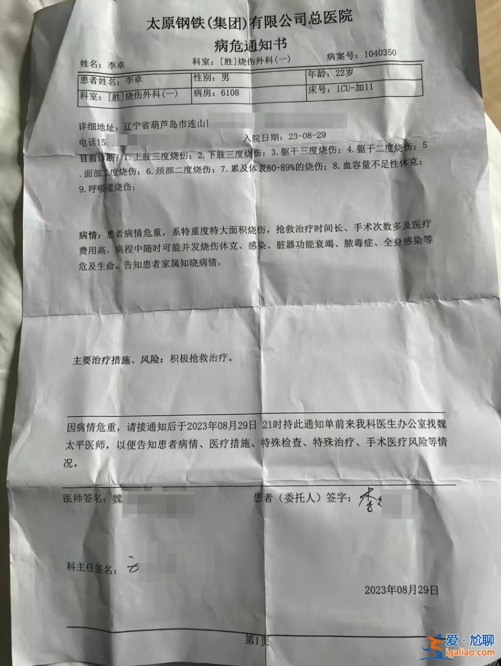 9月10日,紅星新聞記者聯系上該受傷表演者家屬。家屬提供的一份8月29日太原鋼鐵有限公司總醫院病危通知書顯示,患者李卓22歲,收入燒傷外科。“患者病情危重,系特重度特大面積燒傷,搶救治療時間長、手術次數多及醫療費用高,病程中隨時可能并發燒傷休克、感染、臟器功能衰竭、膿毒癥、全身感染等危及生命。”當天,李卓被診斷為上下肢、軀干三度燒傷,面部、頸部二度燒傷,累及體表80%~89%燒傷,血容量不足性休克,呼吸道燒傷等9項癥狀。
