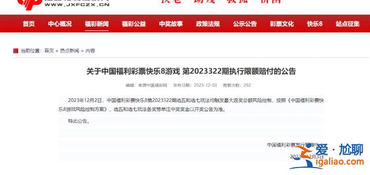 12月3日,中國福利彩票發行管理中心曾發布一則關于中國福利彩票快樂8游戲第2023322期執行限額賠付的公告稱: