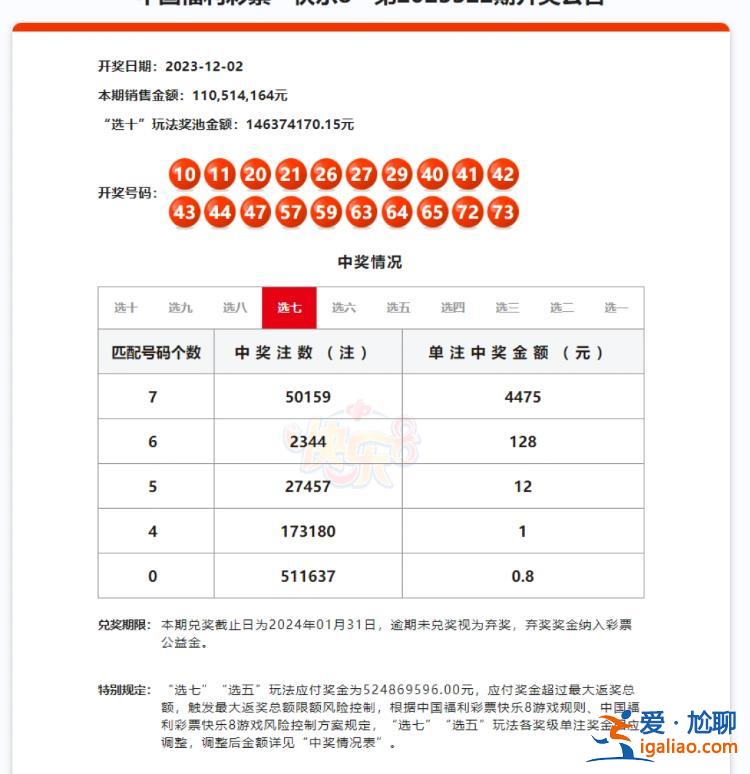 值得一提的是,選七玩法頭獎中獎50159注,單注中獎4475元。其中特別規定稱,選七選五玩法應付獎金為524869596.00元,應付獎金超過最大返獎總額,觸發最大返獎總額限額風險控制,根據中國福利彩票快樂8游戲規則、中國福利彩票快樂8游戲風險控制方案規定,選七選五玩法各獎級單注獎金相應調整。