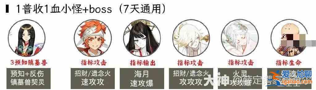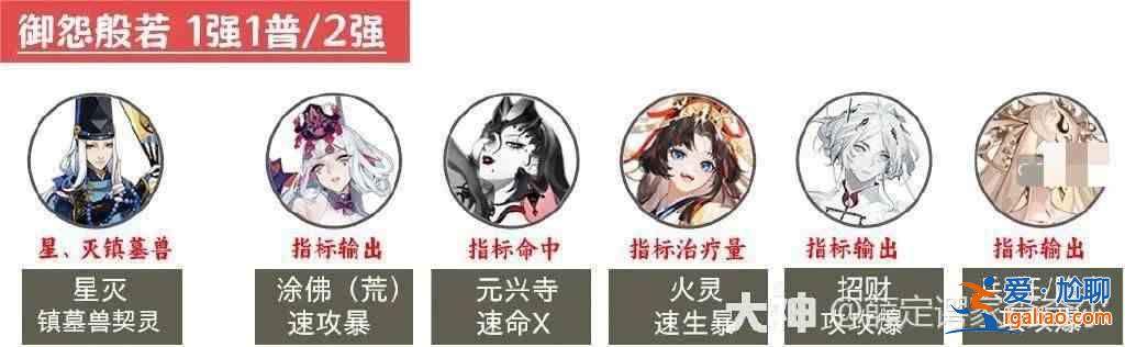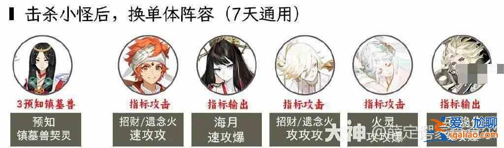 注意:天照需要全隊攻擊力最高(包括晴明、古墓獸,晴明的攻擊力:8824攻擊力)。如果面板不達標/爆炸傷害太低,可以綠標天照(攻擊力仍需高于其他式神)或移除。奇靈