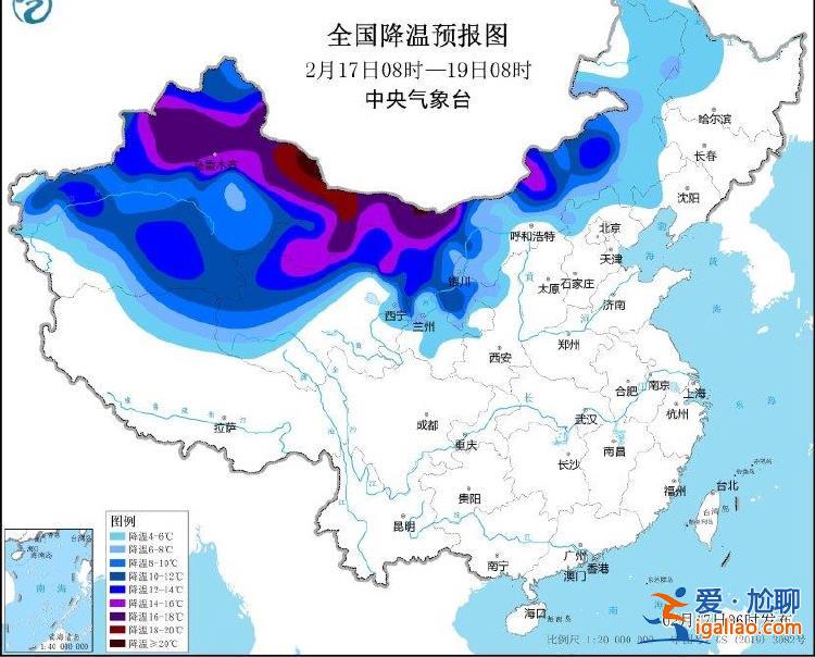 預計,2月17日08時至19日08時,新疆大部、內蒙古中西部、甘肅大部、寧夏、青海北部等地將先后降溫6~12℃,其中,新疆東北部、內蒙古西部、甘肅河西等地部分地區降溫可達12~20℃,局地20℃以上。
