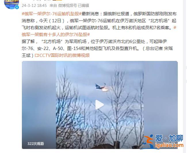 CCTV國際時訊消息,據俄新社報道,俄羅斯國防部剛剛發布消息稱,今天,俄軍一架伊爾-76運輸機在伊萬諾沃地區北方機場起飛時右側發動機起火,運輸機試圖返航時墜毀。機上有8名機組成員和7名乘客。
