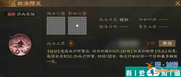 【被動】造成兵刃傷害后,對目標施加50%【斷糧】效果和附帶【流血】效果:每回合受到50.0%兵刃傷害,持續(xù)1回合。每次行動對同一個目標最多觸發(fā)一次。