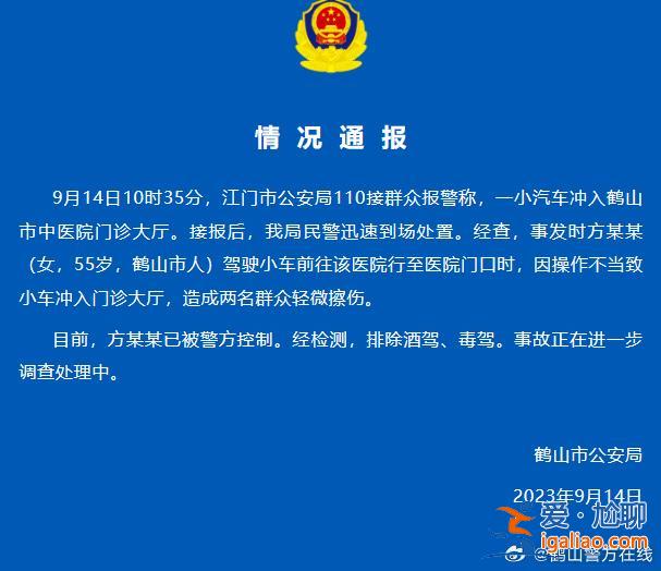 9月14日下午,@鶴山警方在線通報了“汽車沖入廣東鶴山一醫院門診大廳”一事,警方稱系司機操作不當致小車沖入門診大廳,已被警方控制。經檢測,排除酒駕、毒駕。...