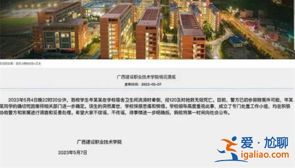 在近日廣西有一所職校發布最新的通報,在通報內容當中有一名學生在自己宿舍洗澡的過程當中突然暈倒,由暈倒時間過長宿舍內的舍友并沒有發覺,最終在120到來之后搶救無效死亡,在事發的第一時間警察也是趕到現場進行調...
