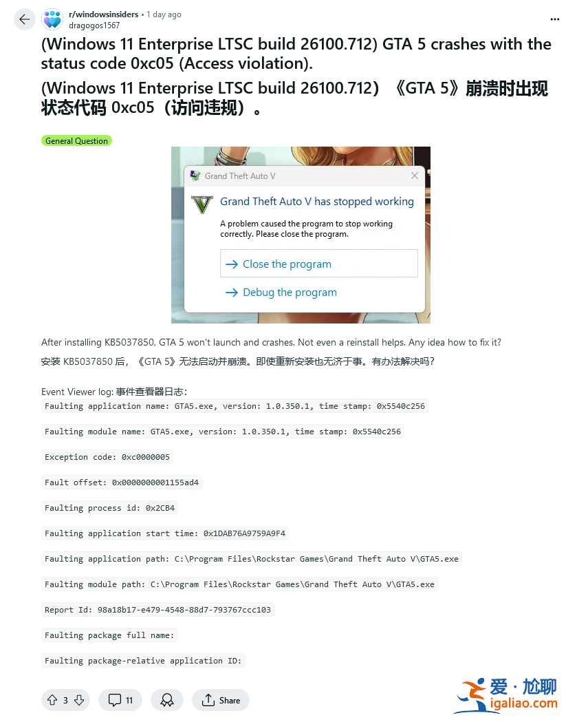 《GTA 5》游戲玩家反饋,Windows 11 Enterprise LTSC 系統(tǒng)安裝 KB5037850 更新升至 Build 26100.712 版本之后,因為不兼容導致游戲出現(xiàn) 0xc0000005 錯誤。這個問題已經(jīng)確認是 Windows 11 24H2 LTSC 的一個已知問題,...