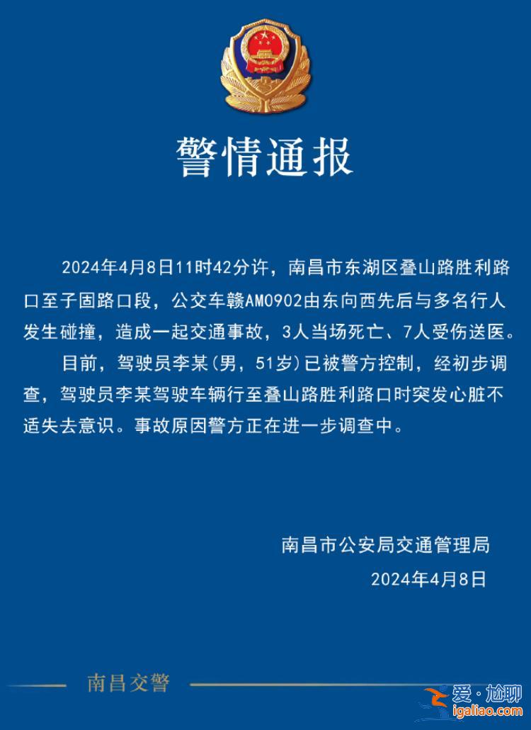 @南昌交警發布警情通報:2024年4月8日11時42分許,南昌市東湖區疊山路勝利路口至子固路口段,公交車贛AM0902由東向西先后與多名行人發生碰撞,造成一起交通事故,3人當場死亡、7人受傷送醫。...