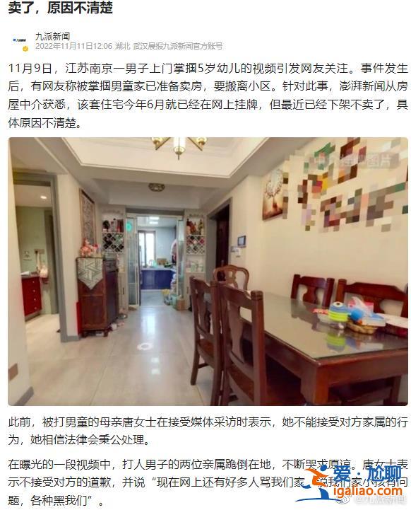 九新聞,11月9日,江蘇南京一男子掌摑5歲小孩的視頻引發(fā)網(wǎng)友關(guān)注。事發(fā)后,有網(wǎng)友稱,被扇耳光的男孩家人準備賣掉房子,搬出小區(qū)。針對此事,該報從房屋中介處了解到,該房屋于今年6月在網(wǎng)上掛牌,但最近已下架,不...