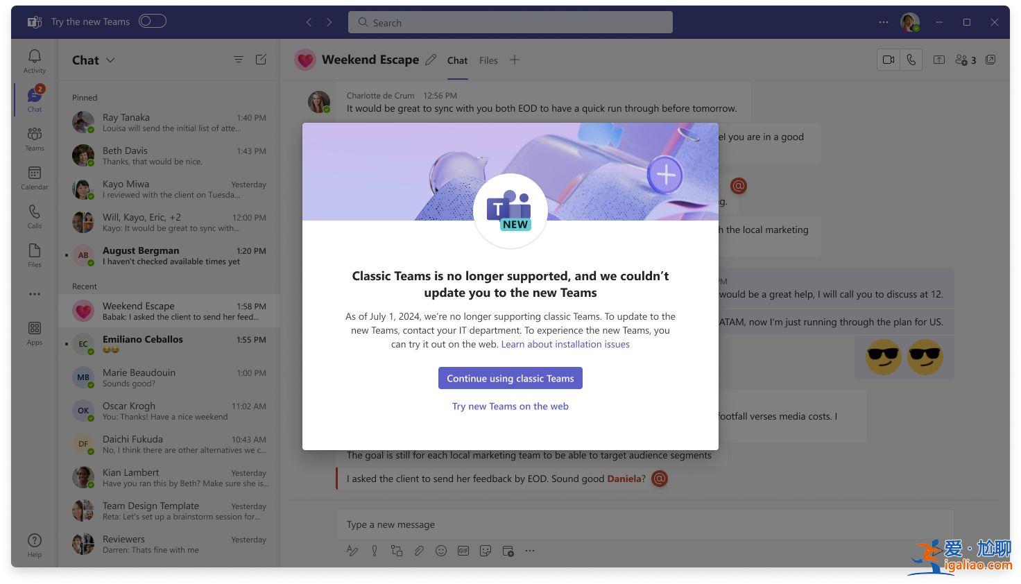 微軟公司今天更新官方支持文檔,表示已經(jīng)通知仍在使用經(jīng)典版 Microsoft Teams 的用戶,該應(yīng)用程序?qū)⒂?2024 年 7 月 1 日停止支持,推薦盡快遷移到新版本中。經(jīng)典版 Microsoft Teams 應(yīng)用在 7 月 1 日停止支持后,微...