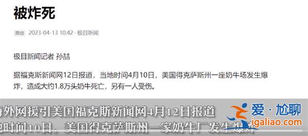 根據外國媒體最新報道,美國當地時間4月10號德克薩斯州的一座奶牛廠發生了爆炸,這起爆炸導致一人受傷,另外造成了1.8萬頭奶牛死亡。美國當地治安辦公室也證實了這則爆炸信息,根據網上的視頻顯示這起報炸事故產生了...