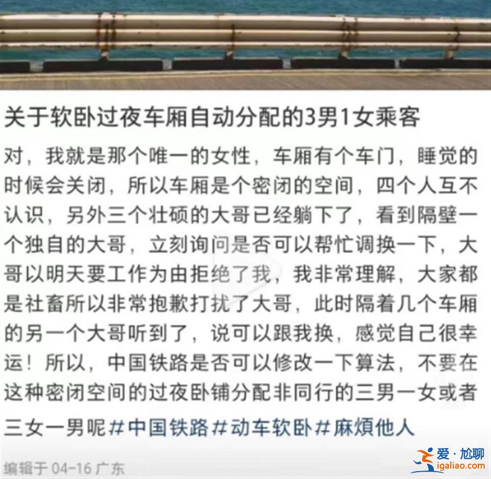 央廣網(wǎng)消息,近日,有女子發(fā)帖“吐槽”稱自己乘坐軟臥過夜車廂時被分配到“3男1女”車廂,四人互不認識,且晚上睡覺時車門會關(guān)閉。不少網(wǎng)友也表示,“3男1女”或“3女1男”的車廂分配的確會讓人感到尷尬,提出能否按...