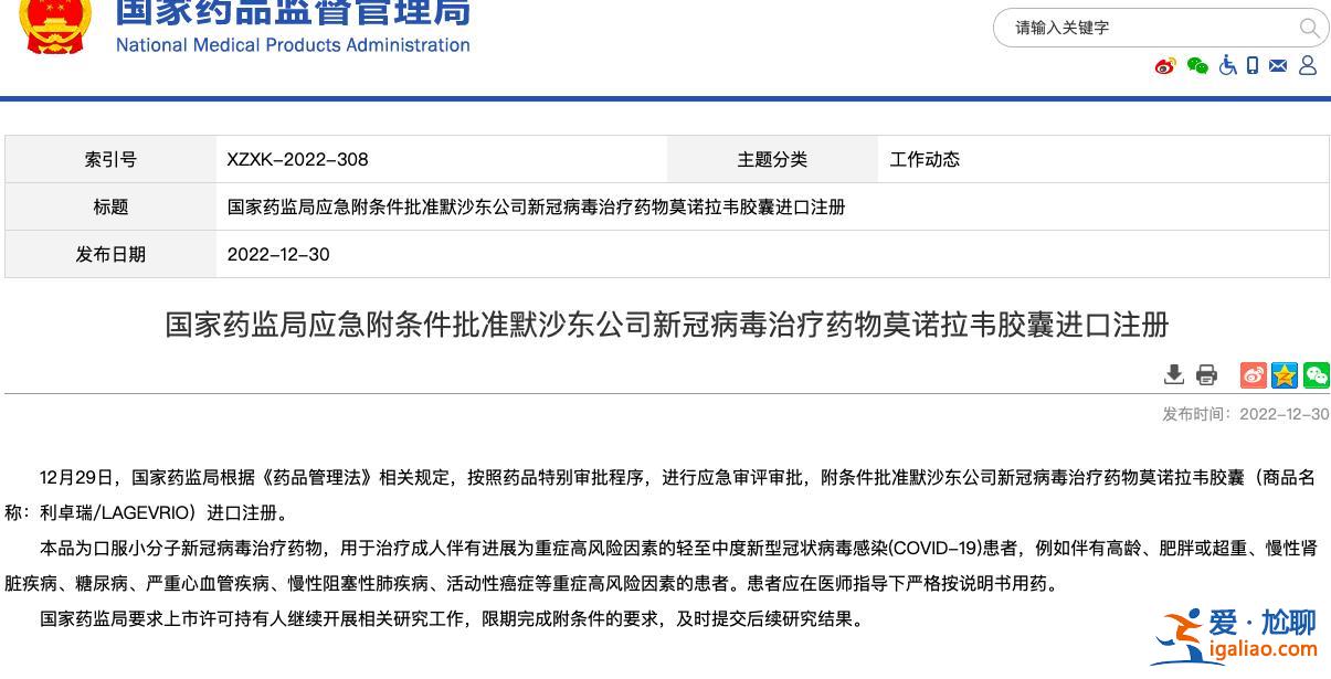 據國家網站消息,12月29日,根據《藥品管理法》相關規定和特殊藥品審批程序,國家進行了緊急審評審批,有條件批準美國默克公司治療藥物單拉韋膠囊在新冠肺炎的進口注冊。...