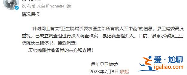 7月7日,網傳河南洛陽伊川縣水寨衛生院院長在開會時,要求醫生多給病人開中藥以提升收入。此事引發網友的廣泛關注。...