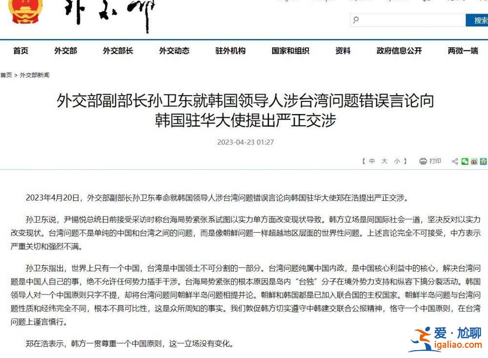 外交部網站消息,2023年4月20日,外交部副部長孫衛東奉命就韓國領導人涉臺灣問題錯誤言論向韓國駐華大使鄭在浩提出嚴正交涉。...