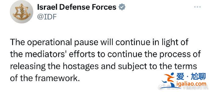@CCTV國際時訊消息,以色列國防軍剛剛通過社交媒體表示,由于斡旋方在釋放被扣押人員上的努力,以色列與巴勒斯坦伊斯蘭抵抗運動之間的臨時?;饘⒗^續延長。...