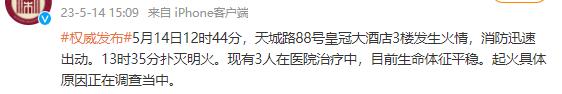 5月14日,杭州市上城區政府新聞辦公室官方微博發布消息稱,杭州一酒店發生火情,目前現場搜救完畢,人員全部疏散,共送醫6人。...